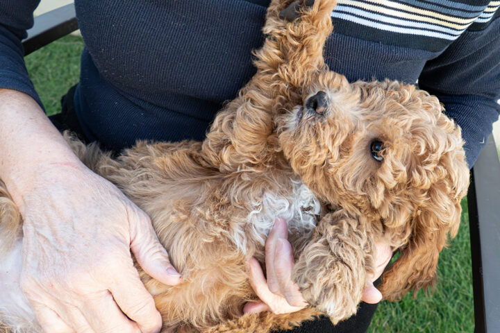 Sunny is a calm, very loving, sweet, and quiet dog. She is super smart and loves to be petted and have her tummy rubbed. She has clear health testing as both of her parent’s have been health tested and are clear. She is a fluffy cream colored Goldendoodle. She is a wonderful dog! Great with all people and other dogs! She weighs 50 pounds.